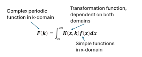 FT is a mathematical method used to transform function between domains by decomposing complex function in one domain into its constituent frequencies and amplitudes as the other or inversely synthesize, recreate function from its transformation components.