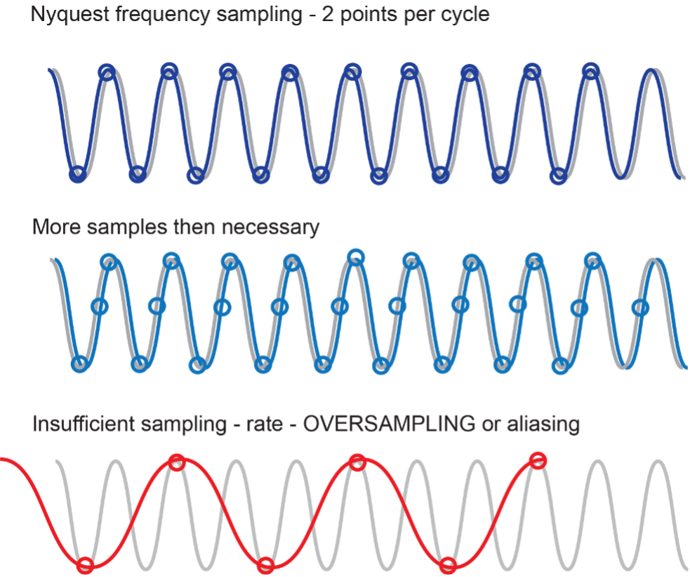 These numbers define what is possible when doing FFT: range of frequencies that can be determined depends on the sampling rate, i.e. how often are measurements in the time domain taken. Nyquist’s sampling theorem states that at least two points are needed to measure frequency and thus only frequencies that are less then half of the sampling rate can be accurately measured. This logically makes sense – without at least two points per cycle the wave can not be accurately imagined.